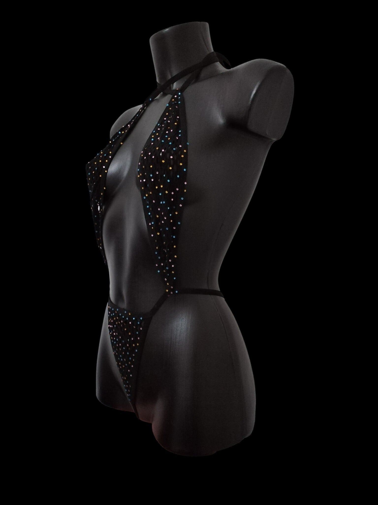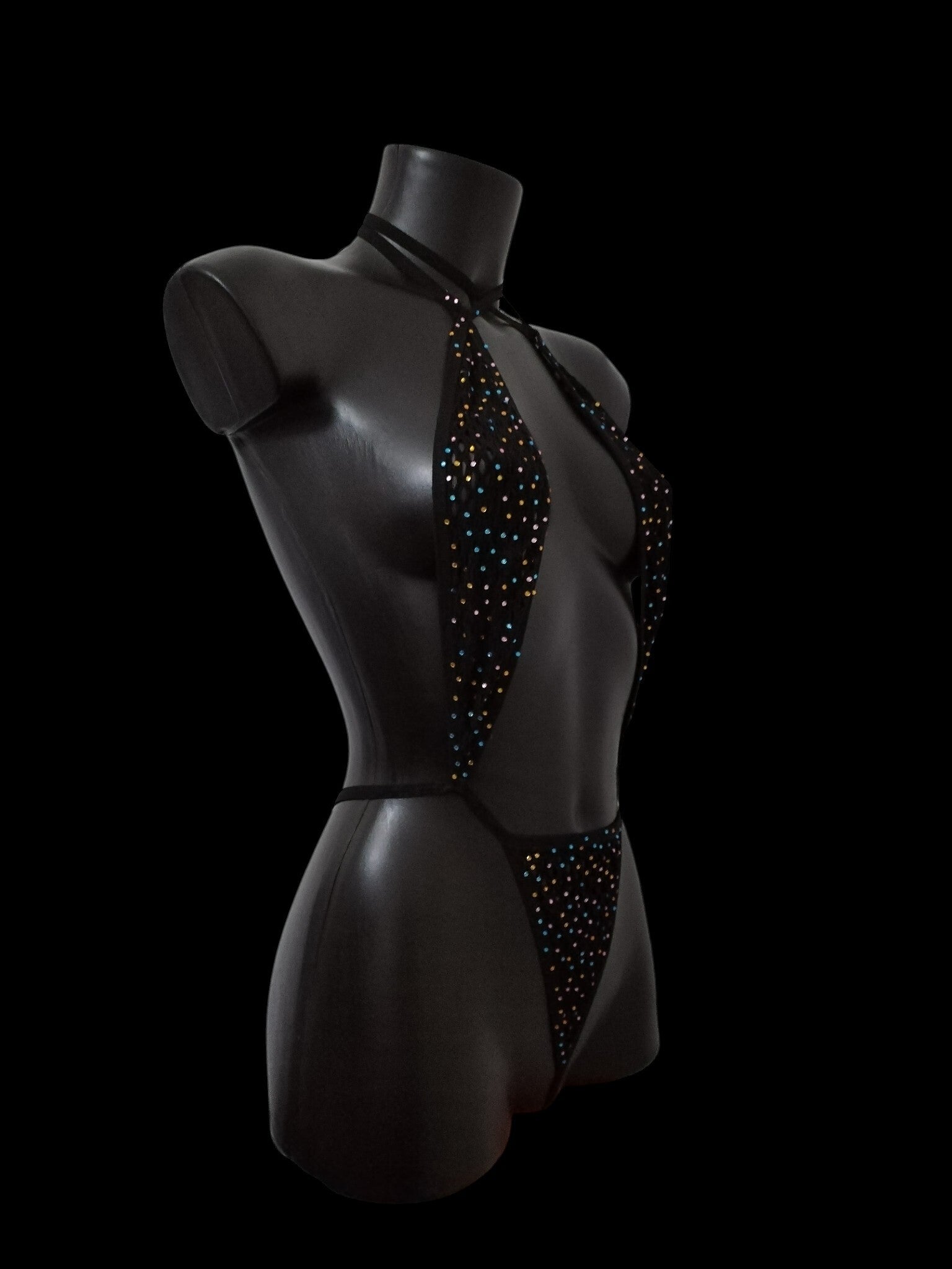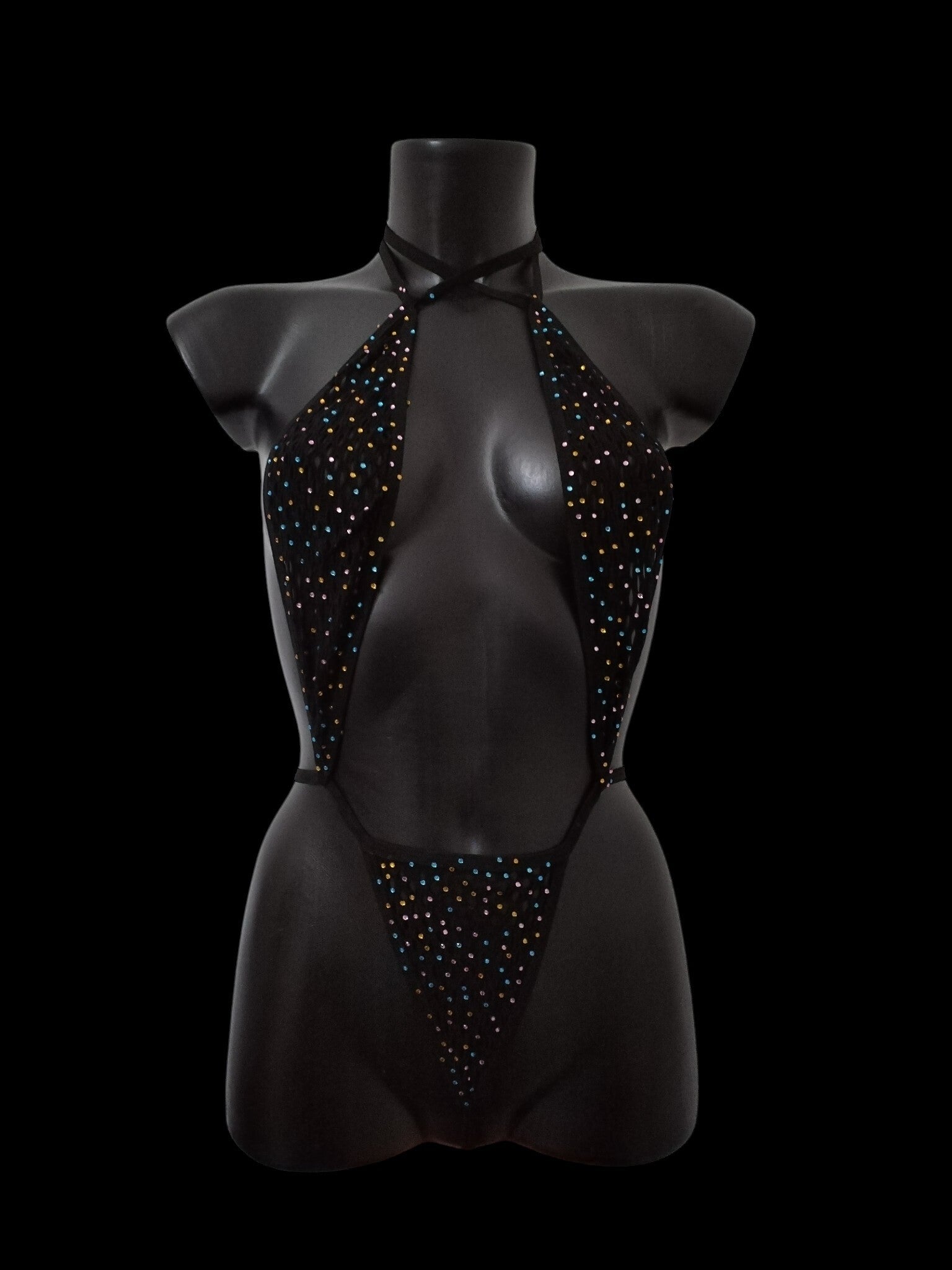 Elegante, audace e scintillante, questo body nero a rete semitrasparente è il massimo della seduzione e dello stile. Il tessuto elasticizzato si adatta perfettamente al corpo, esaltando ogni curva con una vestibilità impeccabile. I delicati strass colorati incorniciano il design, creando un effetto luminoso che cattura lo sguardo e aggiunge un tocco di glamour sofisticato. Il design a perizoma sottolinea la sensualità, mentre la chiusura regolabile al collo consente di personalizzare la vestibilità, offrendo comfort e sicurezza. Un capo sexy, alla moda e assolutamente irresistibile, perfetto per chi ama osare con eleganza nelle serate più speciali.